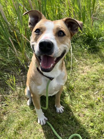 This bully breed mix loves a good rough and tumble playtime, she can get along with other female dogs but definitely feels more comfortable with male dogs who match her energy level. We'd love to see her in a home with a well matched dog friend to get her playful energy out with and keep her active. With energy to spare, she'll be able to keep up on whatever adventure you take her on! That said, once she's gotten her beans out she'll be in your lap for as much cuddling and belly rubbing you can give her.